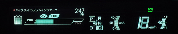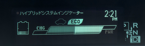 実際にモーターで動いているか、エンジンで動いているかは、このハイブリッドシステムインジケーターで確認できる。上のように「EV」と書かれたマークが表示されていればエンジンはかかってない。コツは、「ふんわり」とアクセルを踏み込み、ゲージがメーターのセンターライン(ECOマーク真下あたり)を超えないようにすることだ。
