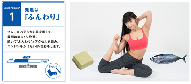 まずは発進。「ふんわり〜な」の異名を持つグラビアアイドル・里菜さんをイメージしながらアクセルを踏もう。ハイブリッドカーの場合、「ふんわり」とアクセルを踏むことで、クルマはモーターの力によって「EV走行」で動き出す。この際エンジンは使わない。つまり、ガソリンを1滴も消費しないのだ。