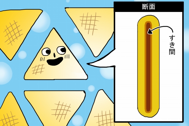 先ほど、ヒミツの機械ちゃんの肩にベルトコンベアが2つ付いていたのは、上のようにすき間を作って空洞を作ることで、サクッとした食感を生み出すためだったのだ。