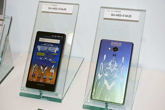 テレビ放送20周年を記念したエヴァンゲリオンとコラボした5.0インチ型のSIMフリー端末エヴァンゲリオン スマートフォン。ベースは同社製のSIMフリースマホ「AQUOS SH-M02」で、背面は初号機をイメージしたホログラムが描かれている。3万台の数量限定でセブン-イレブンの独占販売となっており、11月2日より各店舗にて申込受付が開始される。価格は8,4240円(税込)