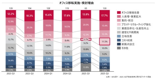 オフィス環境改善やブランド・リクルーティング強化といった人材獲得を見据えた移転理由が回答割合を伸ばしており、優秀な人材を引き付け、社員のエンゲージメントを高めるための「戦略的拠点」として、自社オフィスをより魅力的な環境へアップデートしようとする前向きな姿勢がうかがえる。