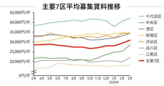 主要7区の平均募集賃料は30,946円/坪で前月比+1,615円/坪