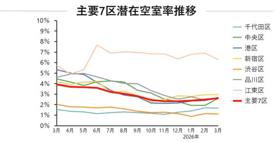 <2026年3月末>東京オフィスマーケット動向 空室率・平均募集賃料 潜在空室率 2.62% (前月比:+ 0.15pt)、平均募集賃料 30,946円/坪 (前月比:+1,615円/坪)