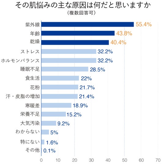 こうした結果から、肌悩みは外的要因だけでなく、内的・生活要因も背景として意識されていることがうかがえます。