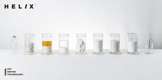 ペットリファインテクノロジーは、独自のPETケミカルリサイクル技術を用いて、使用済みのPETボトルなどを分子レベルに分解し、不純物や色素などを取り除くことで、石油由来と同等品質の再生PET樹脂「HELIX」を製造・販売しています。