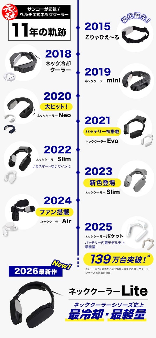 2015年にサンコーが生み出した"ネッククーラー"シリーズは、累計出荷台数139万台を突破。