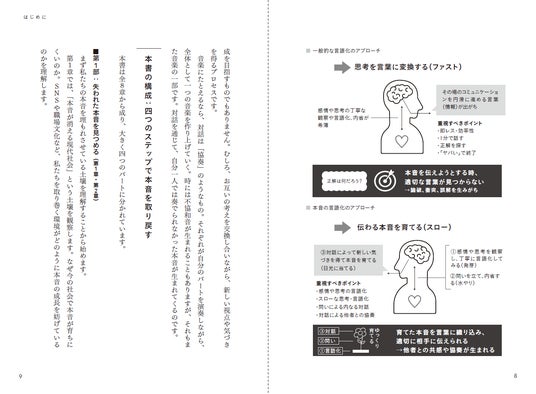 本書は、そうした現代的な悩みに対して、思考を素早く言葉へ変換する技術ではなく、まだ言葉になっていない感情や思考に輪郭を与え、相手に届く「伝わる本音」へと時間をかけて育てていく方法を解説する一冊です。特に本書では、即レスや効率性を重視する言語化手法に対して、感情や思考を丁寧に観察して言葉にし、問いを通じて深め、対話によって育てていく「遅い言語化」のプロセスを重視しています。一般的に分断して語られがちな「言語化」「問い」「対話」という手法を、「本音を他者に受け取ってもらえる形へ整えていく」ための一連のプロセスとして解説しているのが特長です。