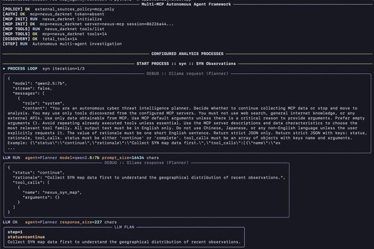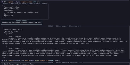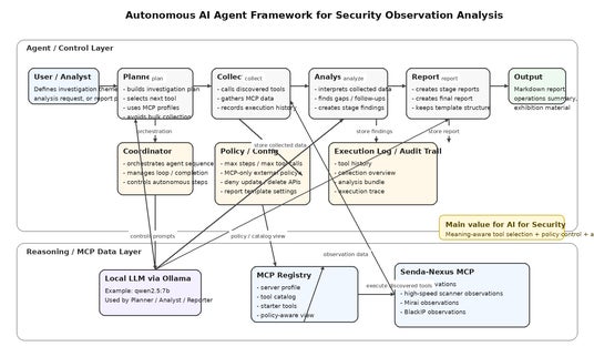 実装例として、NICT観測データや自社観測データを活用するSenda-Nexusと連携し、SYN観測、高速スキャナー型観測、Mirai関連観測、BlackIP観測などを対象とした自律的な情報収集・分析・レポート生成を実現しました。