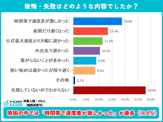 後悔・失敗の具体的な内容を聞いたところ、「時間帯で速度差が激しかった」が18.8%で最多でした。