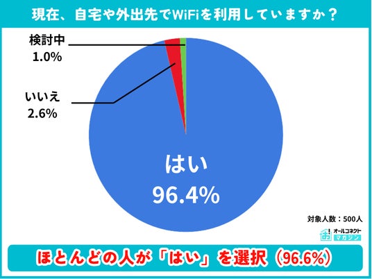 現在、自宅や外出先でWiFiを利用しているかを聞いたところ、96.4%が「はい」と回答しました。WiFiは生活インフラとして定着していることがわかります。