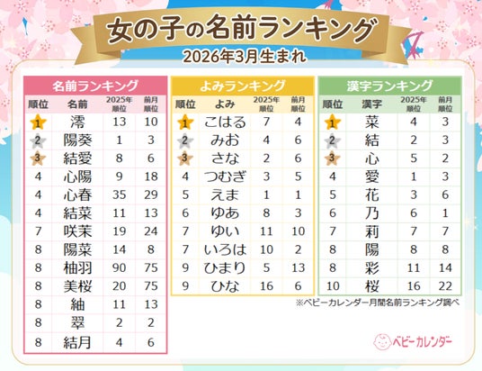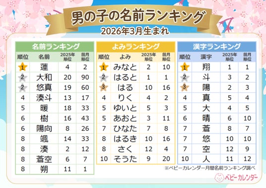 専門家から直接アドバイスを受けられる日本最大※の育児支援サイト「ベビーカレンダー」を運営する株式会社ベビーカレンダー(旧社名:株式会社クックパッドベビー、本社:東京都渋谷区、代表取締役:安田啓司、以下「ベビーカレンダー」)は、赤ちゃんの名前ランキングを毎月調査・発表しています。今回は、2026年3月生まれのお子さま5,894名を対象に調査した『3月生まれベビーの名付けトレンド』を発表します。