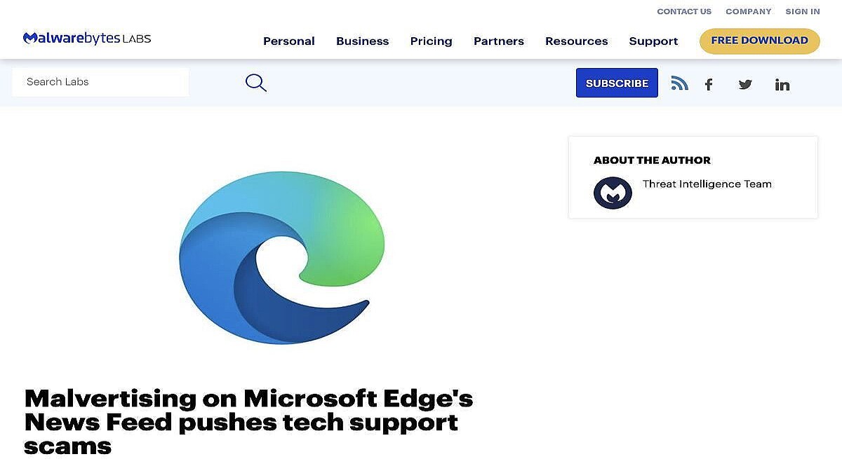 Malwarebytesは9月14日(米国時間)、「Malvertising on Microsoft Edge's News Feed pushes tech support scams」において、Microsoft Edgeのニュースフィードを悪用して、被害者を技術サポート詐欺のページにリダイレクトさせる不正広告キャンペーンを観測したと伝えた。Microsoft Edgeのホームページ上に広告を挿入し、衝撃的な内容や奇妙なストーリーでユーザーを誘い込むという単純なものと説明されている。Malvertising on Mic