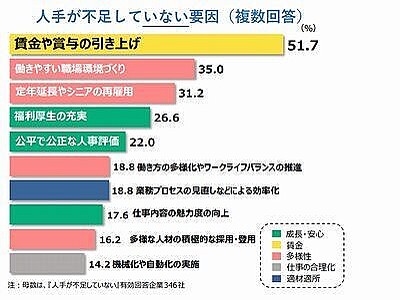 帝国データバンクは5月17日、企業における人材確保・人手不足の要因に関するアンケートの結果を発表した。有効回答企業数は1,033社。日本では人材不足が深刻な問題となっているが、同社が行った調査では、2023年4月に正社員の人手が不足していると感じている企業の割合は51.4%、非正社員は30.7%という結果が出ている。今回、正社員・非正社員の人手不足の状況とその要因について尋ねたところ、「人手が不足していない要因」では