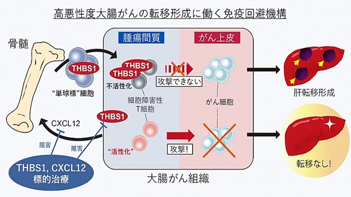 京都大学は10月27日、悪性度が高い大腸がんについて、その転移にトロンボスポンジン-1(以下THBS1)と呼ばれるタンパク質が重要な役割を果たしていることを突き止めたと、発表した。【こちらも】必要な時だけがん免疫のスイッチをオンに京大らの研究THBS1は、骨髄から腫瘍組織に呼び寄せられた細胞から分泌されており、腫瘍間質において免疫細胞の働きを抑制することで、転移を促進するという。■腫瘍間質とは?大腸がんは