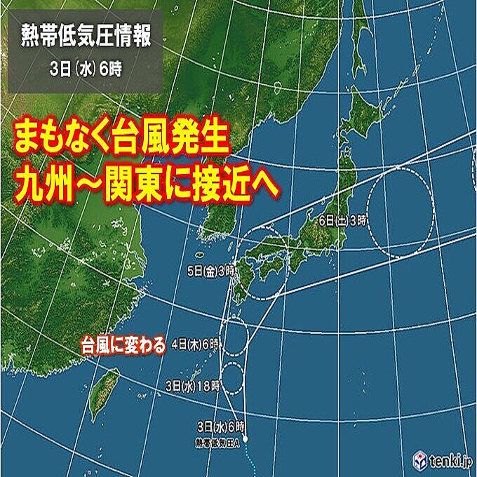 現在、日本の南にある熱帯低気圧は、明日4日の明け方までに台風に発達する見込みです。その後、4日夜から5日にかけて九州〜関東に接近する恐れがあります。特に太平洋側で大雨となる見込みで、土砂災害や川の増水などに警戒が必要です。日本の南でまもなく台風発生5日にかけて九州〜関東に接近へ今日3日の午前6時現在、日本の南には熱帯低気圧があり、明日4日の明け方までに台風に発達する見込みです。台風発生直後に奄美に接近