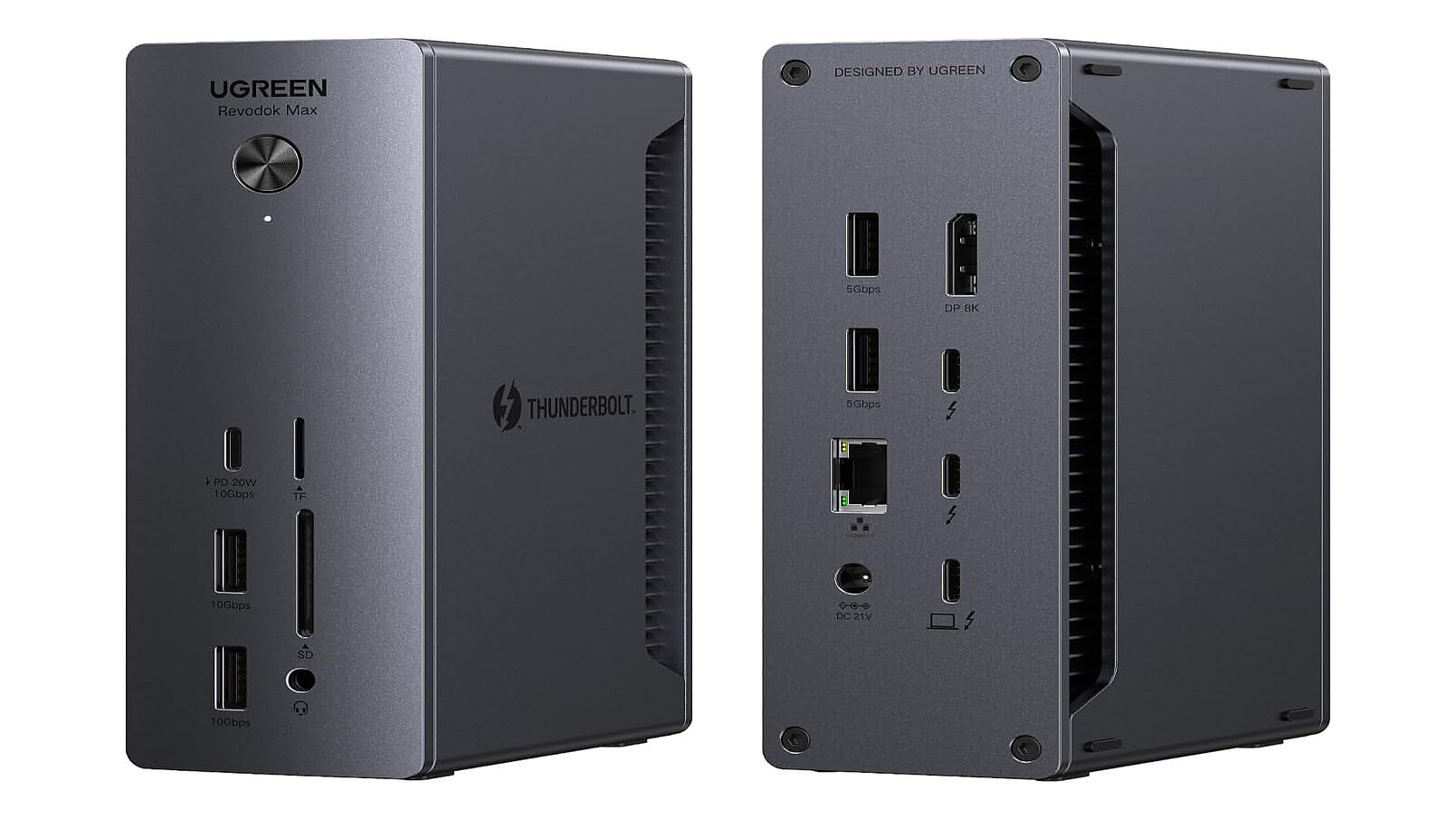 Thunderbolt 4に対応したUGREENのドッキングステーション「Revodok Max 213」が、Amazonで30%OFFのセール中となっている。9月25日(木)現在、参考価格が4万5,880円のところ、3万2,116円で購入可能だ。 Thunderbolt 4ポートでPCと接続することで、Thunderbolt 4×2やUSB Type-C(20W給電対応)×1など13の入出力を拡張できるドッキングステーション。 Thunderbolt 4による映像出力(8K/30Hz、4K/