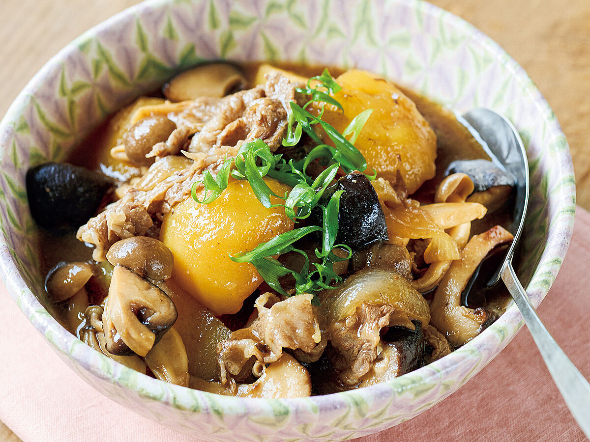 薬膳では、夏の間に大量の汗をかくことで体のエネルギー〈気〉が消耗し、疲労や倦怠感を招くとされています。そこで今回は、疲れをとりたい日に食べたい、〈気〉を補う食材を使った薬膳仕立ての肉じゃがを紹介します。ごま油がふわりと香る甘辛味に、きのこの濃いうまみが合わさり、ご飯もどんどん進みます。『たっぷりきのこの肉じゃが』の薬膳ポイント〈気〉を補う「牛肉」や「じゃがいも」「きのこ」を使って体にうれしいひと皿