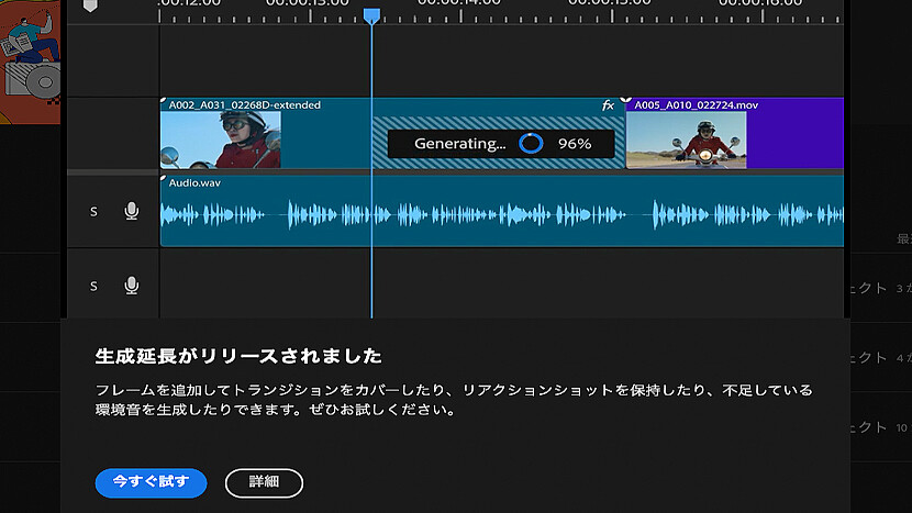 - 「生成延長」は、目的のクリップを生成AIにより数秒間延長できる機能