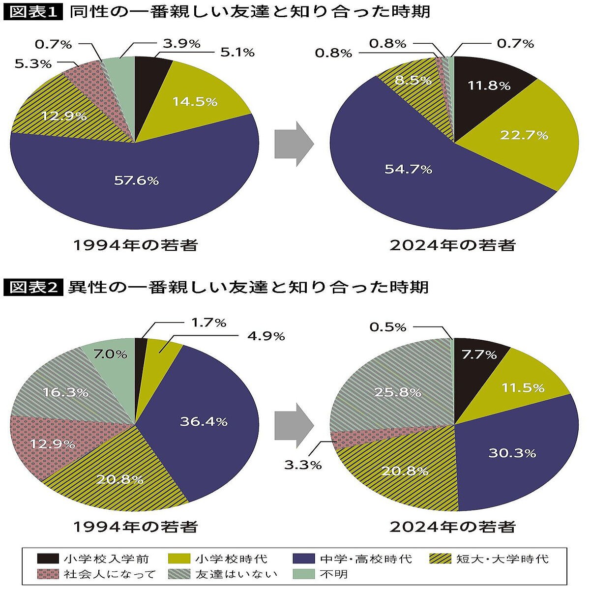 ニューストップ > IT 経済ニュース > 経済総合ニュース > 「同性の幼なじみがそのまま親友になる」ケースがZ世代で増加 部活 Z世代 趣味 インタビュー 受験 広告 アプリ 性格 ネタ 人生 大学生 社会人 家族 プレジデントオンライン 「同性の幼なじみがそのまま親友になる」ケースがZ世代で増加 2025年9月30日 8時15分 リンクをコピーする 博報堂生活総合研究所の調査によると、「同性の幼なじみがそのまま親友になる」ケースがZ世代で増えている。なぜ、今の若者は幼い頃の関係性が長く続くのか。『Z家族データが示す「若者と親」の近すぎる関係』(光文社新書)から、その実態を紹介する――。■Z世代は幼なじみがそのまま親友に本稿では、Z世代の幸せにとって欠かせない、大切な関係に注目します。「同性の幼なじみが、そのまま親友になっている」ケースの増加です 記事を読む おすすめ記事 「恋愛感情はなかった」 数回にわたり交番勤務中に性行為 神奈川県警、署員2人懲戒処分 投書で発覚 2025年11月7日 21時50分 26年前の名古屋主婦殺害、安福久美子容疑者は被害女性の夫不在の日を把握か 5カ月前のOB会で「週末も出勤」と会話…事件は土曜に発生 2025年11月6日 12時6分 テレ朝「ナンバーワン戦隊ゴジュウジャー」 ユニコーン役の今森茉耶の降板発表「20歳未満での飲酒行為」 2025年11月8日 13時57分 「家族ごと殺すぞ」教諭に暴行し脅迫か 15歳男子中学生が逮捕 授業を抜け出し遊んでいたところ注意され逆上=静岡県警 2025年11月7日 21時14分 「イチャモンつけたいだけ」山本太郎氏 参院で「秋の叙勲」めぐり高市首相を追及も…あっさり“論破”されSNS呆れ声 2025年11月7日 19時35分