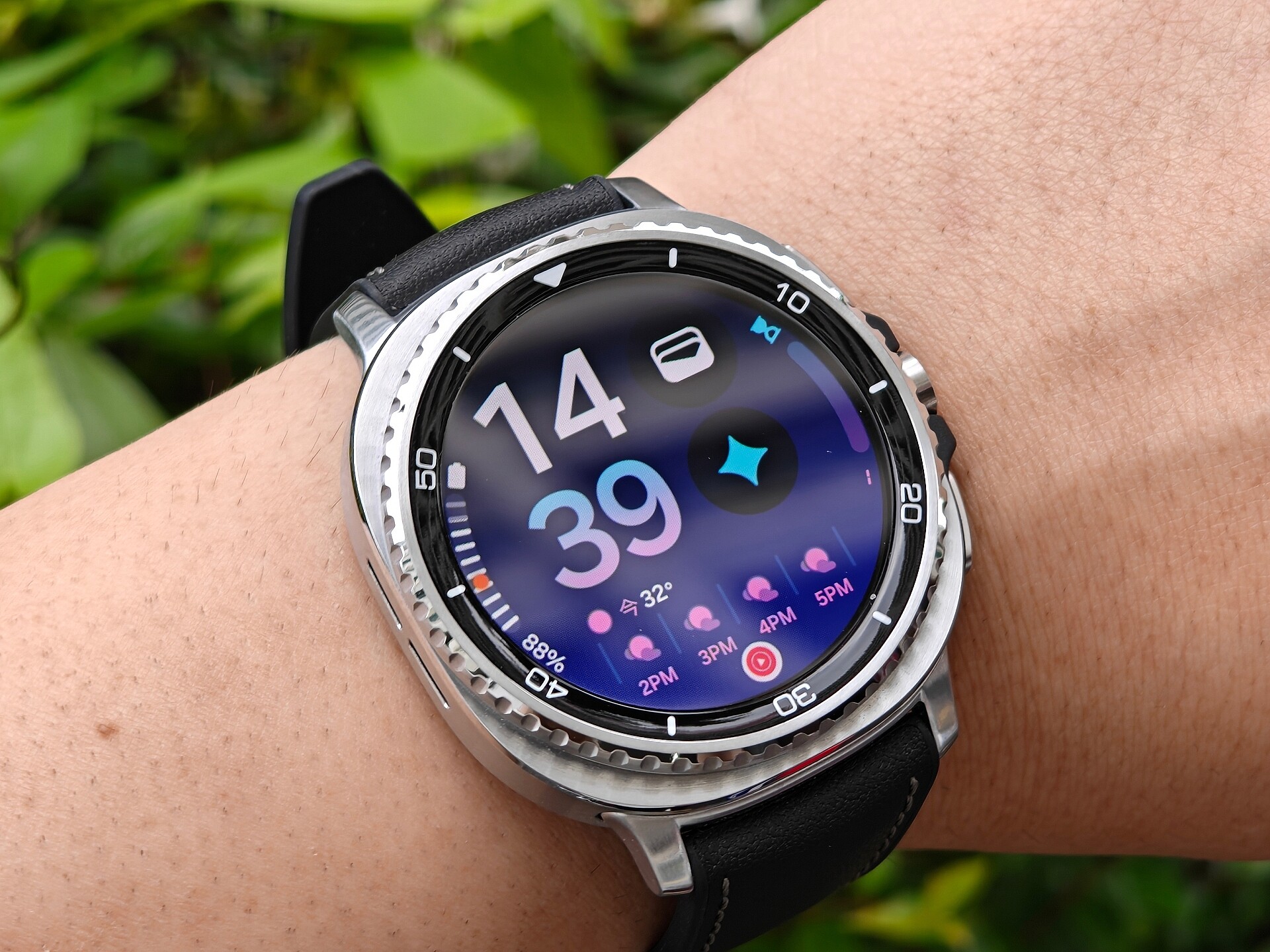- 回転ベゼルを搭載するGalaxy Watch 8 Classicを筆者が紹介している