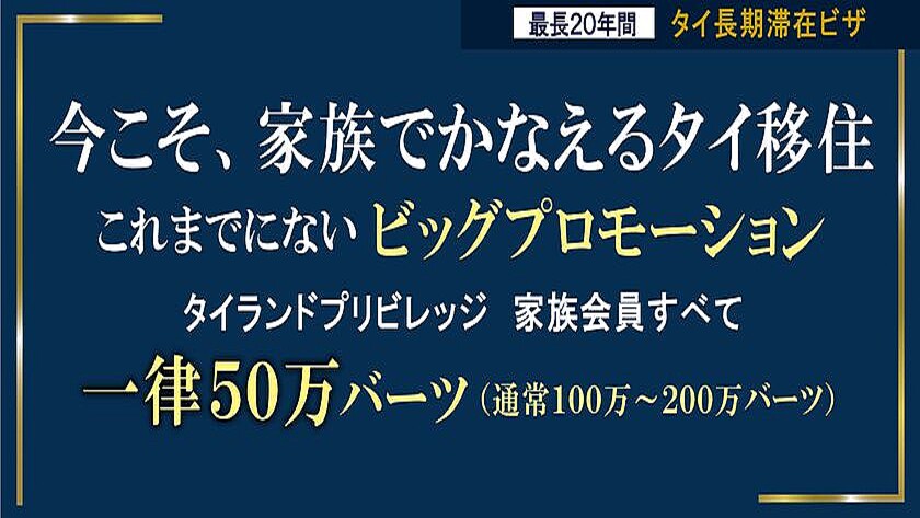 タイの長期滞在プログラム「タイランドプリビレッジ」の日本正規代理店「タイランエリートインフォメーションセンター」は、家族メンバーシップがお得になる「家族会員ビッグプロモーション」を2025年12月26日まで延長開催します。さらに、最大100万円分の商品券がもらえる「ミリオンキャンペーン」も同時開催され、家族でのタイ移住を検討している方にとって絶好の機会です! タイランエリートインフォメーションセンタ