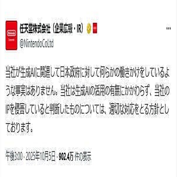 任天堂株式会社の企業広報・IR公式Xが2025年10月5日、生成AIに関する誤情報を否定した。「日本政府に対して何らかの働きかけをしているような事実はありません」任天堂は、日本語と英語で「当社が生成AIに関連して日本政府に対して何らかの働きかけをしているような事実はありません」との声明を発表した。「当社は生成AIの活用の有無にかかわらず、当社のIPを侵害していると判断したものについては、適切な対応をとる方針としてお