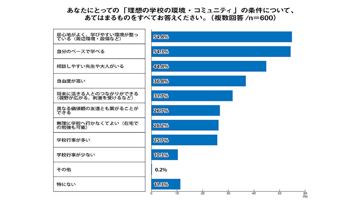 プレマシードは9月25日、「Z世代の理想の学校調査」の結果を発表した。同調査は8月8日〜18日、15〜22代のZ世代男女600人を対象に、インターネットで実施した。あなたにとっての「理想の学校の環境・コミュニティ」の条件について、あてはまるものをすべてお答えください理想の学校の環境について尋ねたところ、「居心地がよく、学びやすい環境が整っている(周辺環境・設備など)」(54.8%)が最も多く、「自分のペースで学べる」(54.3
