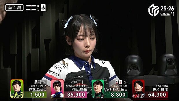 その1牌の後先がいじわるすぎる…。「大和証券Mリーグ2025-26」、10月6日の第1試合に出場したKADOKAWAサクラナイツ・岡田紗佳(連盟)が、大逆転による初トップも狙える大チャンスだったものの、山に積まれた牌の後先に翻弄され、思わずかわいくしょんぼりした顔がカメラに捉えられた。【映像】いじわるな山に美麗な顔→しょんぼり顔に…南4局1本場、岡田は3万5900点持ちの2着目だった。トップ目のEX風林火山・勝又健志(連盟