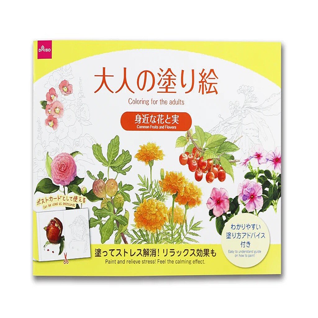 - ダイソーで販売されている「大人の塗り絵」を紹介している