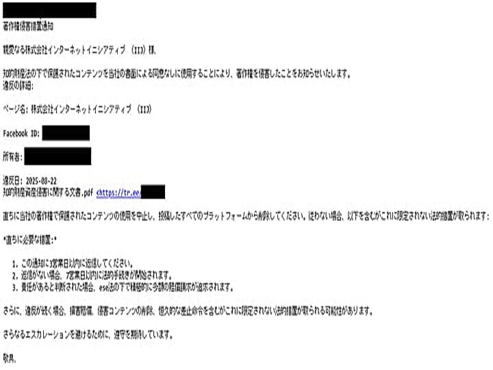 ネットワークサービス事業を手掛ける、IIJ(株式会社インターネットイニシアティブ / Internet Initiative Japan Inc.)が運営するセキュリティ情報発信サイト「wizSafe Security Signal」にて、攻撃メールに関する情報が公開されました。「著作権を侵害しています」という内容のメールが届いても落ち着いてwizSafe Security Signal(以下wizSafe)によると、「著作権を侵害しています」という内容で偽装したメールが、2025年8月末