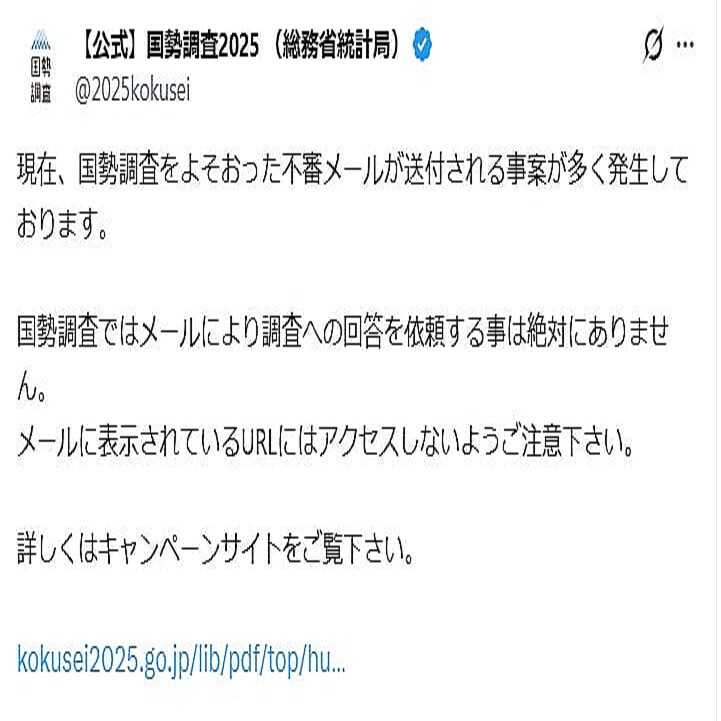 ニューストップ > 国内ニュース > 国勢調査を装う、不審メールに注意を 総務省統計局が公式Xで注意喚起 時事ニュース 迷惑メール 国勢調査 オトナンサー 国勢調査を装う、不審メールに注意を 総務省統計局が公式Xで注意喚起 2025年10月8日 20時25分 リンクをコピーする 10月8日、5年に一度行われる「国勢調査」の回答期限を迎えました。SNS上では「国勢調査、回答を終え、投函しました!」「国勢調査、ネット回答めっちゃ楽」「国勢調査今日までだったので慌てて回答した」という声がある一方、「国勢調査の回答すっかり忘れてた」「まだ国勢調査回答してなくてマジでやばい」といった声も上がっており、これからネットを通じて回答する人もいるのではないでしょうか。そんな中、国勢調査を装っ ◆「総務省統計局」公式Xでの投稿現在、国勢調査をよそおった不審メールが送付される事案が多く発生しております。国勢調査ではメールにより調査への回答を依頼する事は絶対にありません。メールに表示されているURLにはアクセスしないようご注意下さい。詳しくはキャンペーンサイトをご覧下さい。https://t.co/veZ0j0iMFf— 【公式】国勢調査2025 (総務省統計局) (@2025kokusei) September 19, 2025 記事を読む おすすめ記事 日本テレビ・菅谷大介アナウンサー(53)死去 スポーツ実況などで活躍 2025年11月10日 14時15分 カメラに親指立て笑顔…NHK党・立花孝志容疑者を送検 10月のドバイに渡航明らかに…警察は“逃亡の恐れ”と判断し逮捕 2025年11月10日 11時55分 中国の駐大阪総領事、高市首相に「その汚い首は一瞬の躊躇もなく斬ってやる」 「台湾有事」めぐり暴言→削除 2025年11月9日 22時0分 自殺した4人の遺族がチャットGPT開発元のオープンAIを提訴 「安全性テストの期間を意図的に短縮した」と主張 2025年11月8日 4時10分 オズワルド伊藤 イワクラとの破局は「98%俺が悪かった。ストレスを与えすぎた」 理由を赤裸々告白 2025年11月9日 17時26分