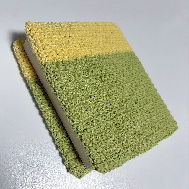 『同僚に「それはどういう意図の配色?」って聞かれた手編みのブックカバー』【写真】テニプリ「推し校概念バージョン」のブックカバーもそんなつぶやきとともに投稿されたブックカバーが「X」で大きく注目されました。カバーの色は1対3くらいの割合で、やわらかな黄色とくすんだ緑色で構成されています。かぎ針編みらしい毛糸のあたたかな風合いがいかにも読書の秋にピッタリですね。このチャーミングなブックカバーはたくさん