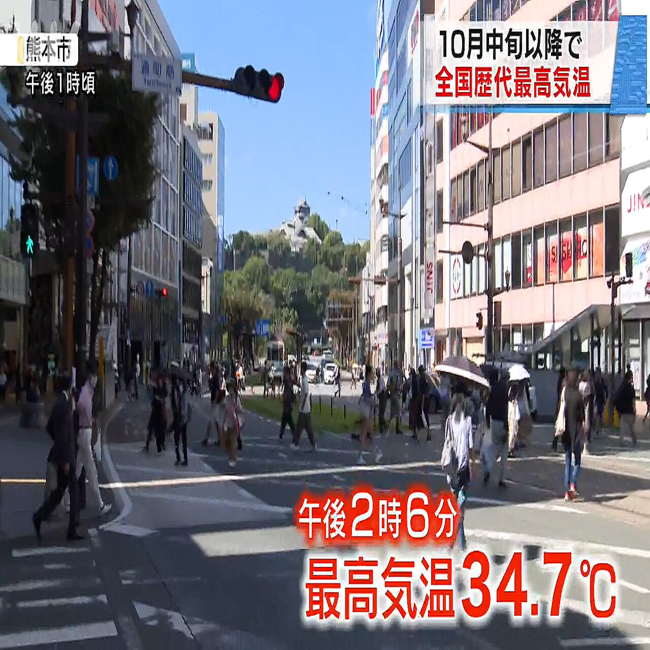 熊本市では11日、最高気温が34.7℃まで上がり、10月中旬以降の記録としては全国でも歴代最高を記録しました。熊本市では午後2時過ぎに最高気温34.7℃になりました。 これは10月の気温として県内歴代最高で、10月中旬以降の気温としては全国歴代最高の暑さです。 熊本市の中心商店街では11日、城下町くまもと銀杏祭が開かれています。飲食ブースや特設ステージで多くの人が楽しみました。 11日は午後9時まで開