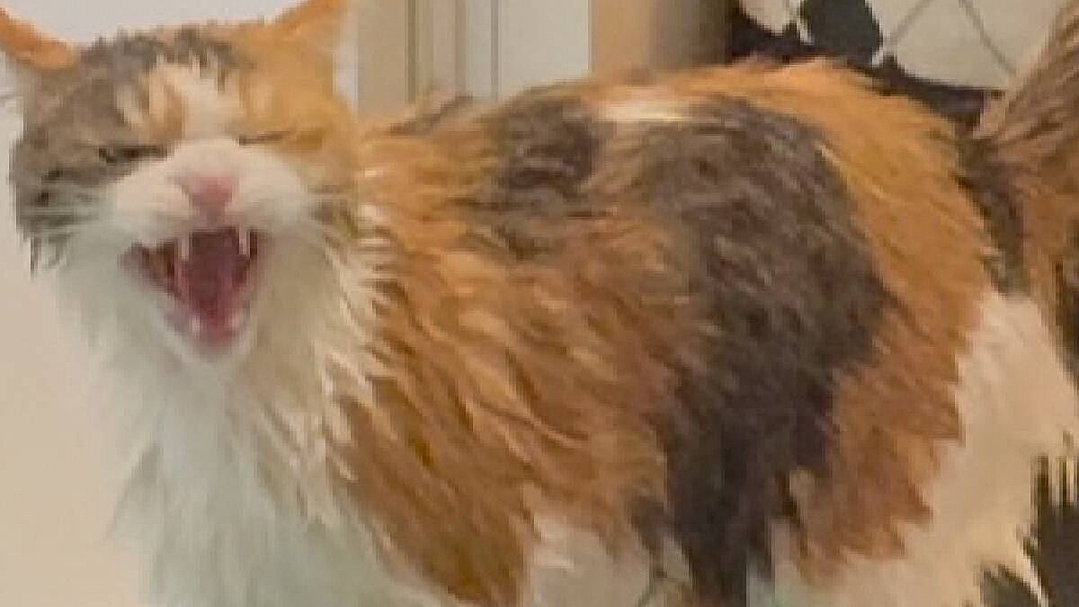 - びしょ濡れになった猫は飼い主に「なんてことを!」と叫んでいるようだ