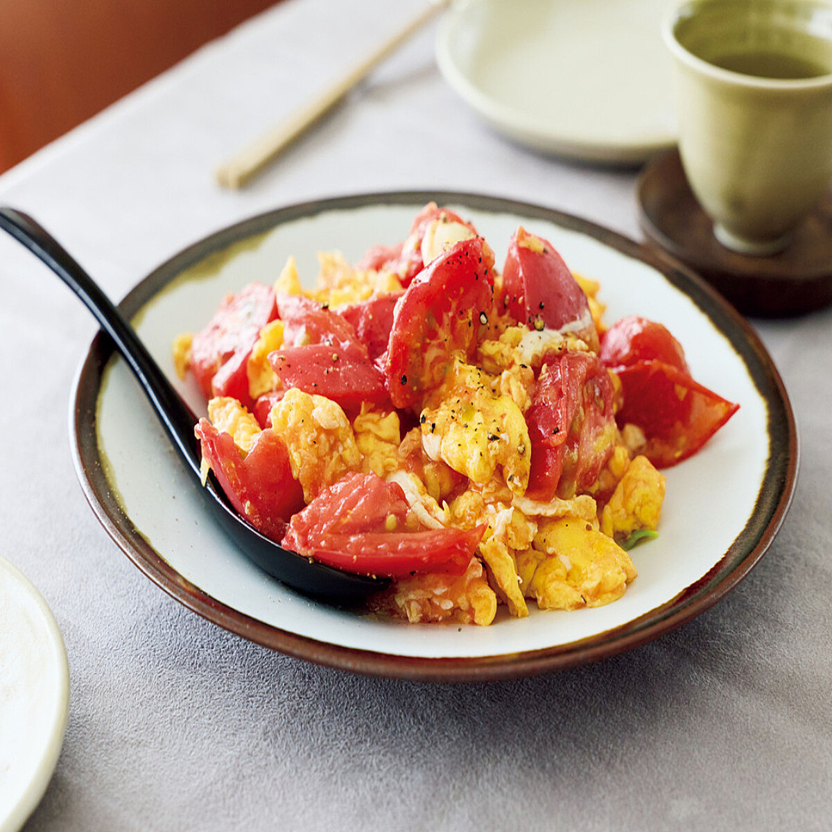 ふんわり卵ととろとろトマトが口の中でとろける、絶品の炒めもの。卵をフライパンで大きくかたまりにするのが〈ふわとろ〉の秘訣。家庭でも簡単にプロの味わいが楽しめます。白いご飯と一緒に味わえば、もうたまらない。想像以上のジューシーさを、ぜひ堪能してください!『卵とトマト炒め』のレシピ材料(2人分)溶き卵……3個分 トマト……2個 塩(粒が粗めのもの)……小さじ1/3 にんにく(たたく)……1かけ 粗びき黒こしょう