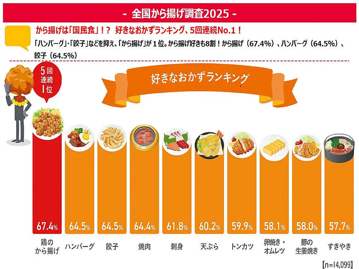 ニチレイフーズは10月6日、「全国から揚げ調査2025」の結果を発表した。調査は2025年8月18日〜28日、全国の20〜79歳の男女14,099名を対象にインターネットで行われた。好きなおかずランキング調査回答者に、全30品のおかずから好きなものを選択(いくつでも選択可)してもらったところ、全体の67.4%が「から揚げ」を選択。5回連続で好きなおかずランキング第1位に輝いた。2位には「ハンバーグ(64.5%)」、「餃子(64.5%)」が同率ランク