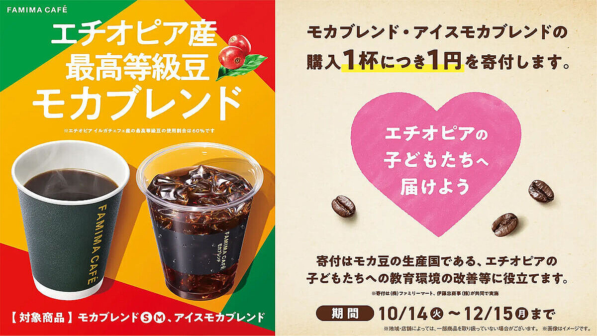 ファミリーマートは10月14日、伊藤忠商事とともに、FAMIMA CAFÉの「モカブレンド」(S 170円/M 250円)、「アイスモカブレンド」(190円)の販売数に応じてエチオピアのこどもたちの教育環境の改善に役立てられる寄付の取り組みを、沖縄県を除く全国のファミリーマートで開始する。FAMIMA CAFÉ「モカブレンド」生産国を支援○「モカブレンド」生産国支援の取り組み、2年目に突入同社のモカブレンドは、最高等級豆を100%使用