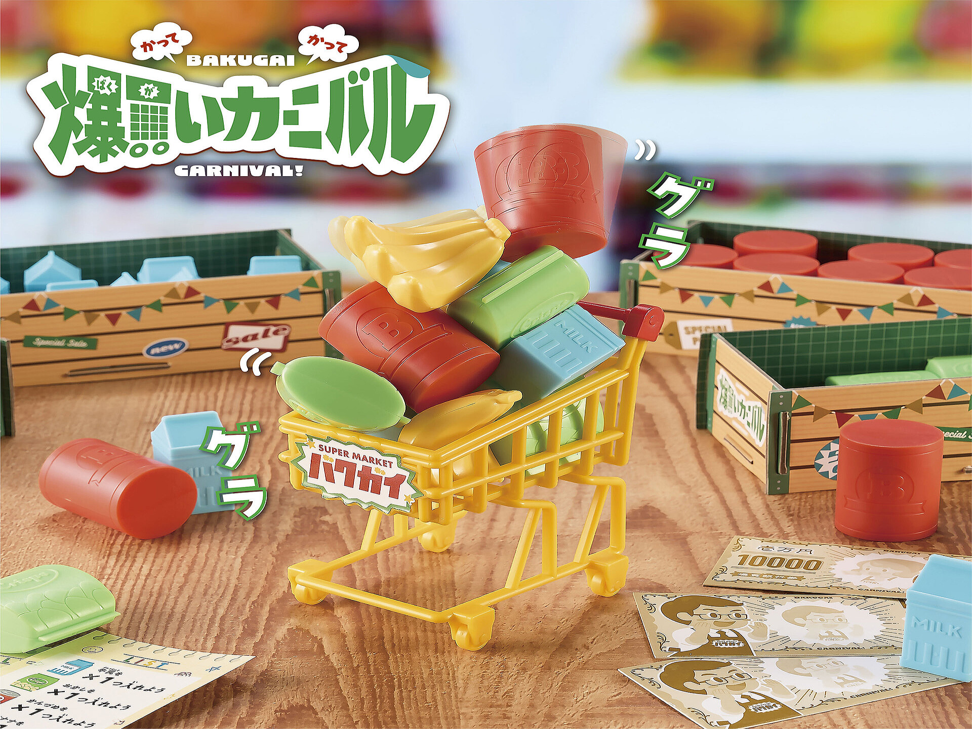 - 指定された商品を積み、落としたプレーヤーが全部買う対戦ルールも楽しめる
