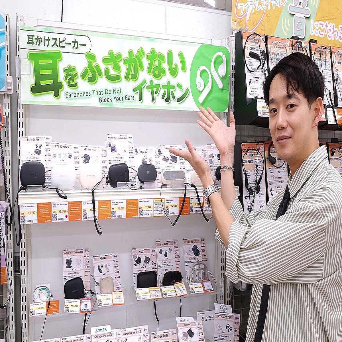 今回は、イヤホン専門店のe☆イヤホン秋葉原店 本館を訪ね、耳をふさがないオープンイヤータイプの完全ワイヤレスイヤホンの売れ筋を取材しました。このタイプは、スポーツのお供として人気のイヤーフック付きが以前から人気ですが、同店スタッフのゆーでぃ氏は、近ごろは別のトレンドが台頭していると言います。「外耳を挟んで固定するイヤーカフ型のラインアップがかなり増えていて、ランキング上位もそちらのタイプが中心になっ