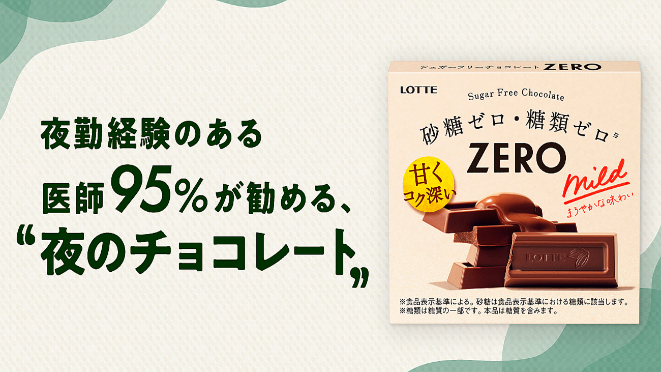 ニューストップ > 国内ニュース > 夜勤医師が勧める夜チョコレート PR企画 コラボニュース 夜勤医師が勧める夜チョコレート 2025年10月28日 17時0分 リンクをコピーする by ライブドアニュース編集部 ざっくり言うと ロッテ「ZEROチョコレート」が、医師100名に調査を実施 夜勤をしている医師の76%が、チョコレートを我慢している実態が明らかに 一方で多くの医師が「ZEROチョコレートなら取り入れたい」と評価している ◆ロッテ「ZEROチョコレート」詳細はこちら 記事を読む おすすめ記事 【速報】「Aぇ!group」草間リチャード敬太さん(29)を略式起訴 公然わいせつの罪 東京区検 2025年11月13日 16時39分 「電子レンジ、サランラップ、缶詰…に共通するものは?」国民・榛葉幹事長が突然のクイズ…高市総理が“即答した答え” 2025年11月14日 6時0分 サイバーエージェント・藤田晋社長、退任を発表 今後は会長に ブログで社長交代に至った経緯や今後の見通し明かす 2025年11月14日 20時56分 【速報】サッカー日本代表の中村敬斗選手へのストーカー容疑で65歳の自称フリージャーナリストの女逮捕 2025年11月14日 18時9分 「漫画村」星野ロミ氏、前科有りの「生きにくさ」を告白 住居も、銀行口座もハードル高く… 2025年11月14日 19時8分