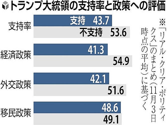 【ワシントン=阿部真司】米国のトランプ大統領が返り咲きを果たした昨年の大統領選で大勝してから、5日で1年を迎える。支持率は就任時から低下しているが、民主党への期待が高まっているとは言えず、来年の中間選挙に向けて経済政策や外交が課題になる。トランプ氏は11月3日、自身のSNSに「私は多くの戦争を終わらせ、米国史上最高の経済を築き、インフレを抑えている」と投稿し、政権のこれまでの実績を強調した。米