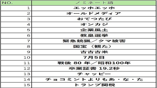 ニューストップ > 国内ニュース > 社会ニュース > 「2025 T&D保険グループ新語・流行語大賞」のノミネート語30が決定 流行語大賞 エンタメ・芸能ニュース livedoor 「2025 T&D保険グループ新語・流行語大賞」のノミネート語30が決定 2025年11月5日 14時0分 リンクをコピーする by ライブドアニュース編集部 ざっくり言うと 11月5日、「2025 T&D保険グループ新語・流行語大賞」のノミネート語が決定 「エッホエッホ」「古古古米」「7月5日」「ミャクミャク」などの30語 この中から12月1日にトップテンが発表される 記事を読む おすすめ記事 「子供達が主役のところで何してんだ」アンパンマンショーで“父親どうし”がケンカ…弁護士は「犯罪にあたる可能性」指摘 2025年11月17日 18時14分 北海道猟友会の会長「クマ駆除から猟友会外してほしい」「一人も会員なくしたくない」…本音を吐露 2025年11月18日 6時55分 全国で大量発生中「庭の木の枝についた白いふわふわ」いったい何?「団地の壁にも」「放置せず駆除を」 2025年11月18日 7時25分 木村拓哉「事務所なぜ残った?」有働由美子の質問への回答が話題…独立相次ぐなかでの “スター” としての立ち位置 2025年11月17日 17時30分 受信料の支払い督促10倍に NHK、未払い1年以上が対象 2025年11月17日 18時51分