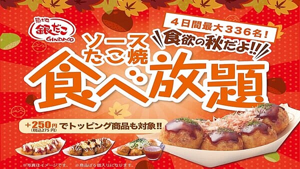 毎年好評を博している銀だこの“食べ放題”企画。11月25日から28日の4日間、イオンモール及びイオンに出店している37店舗で開催されることが発表されました。【その他の画像・さらに詳しい元の記事はこちら】「築地銀だこ 食べ放題」は、イオングループの「イオン超!ブラックフライデー」内の特別企画として毎年実施されているもの。人気No.1商品の「ぜったいうまい!! たこ焼(ソース)」が、45分間食べ放題になります。す