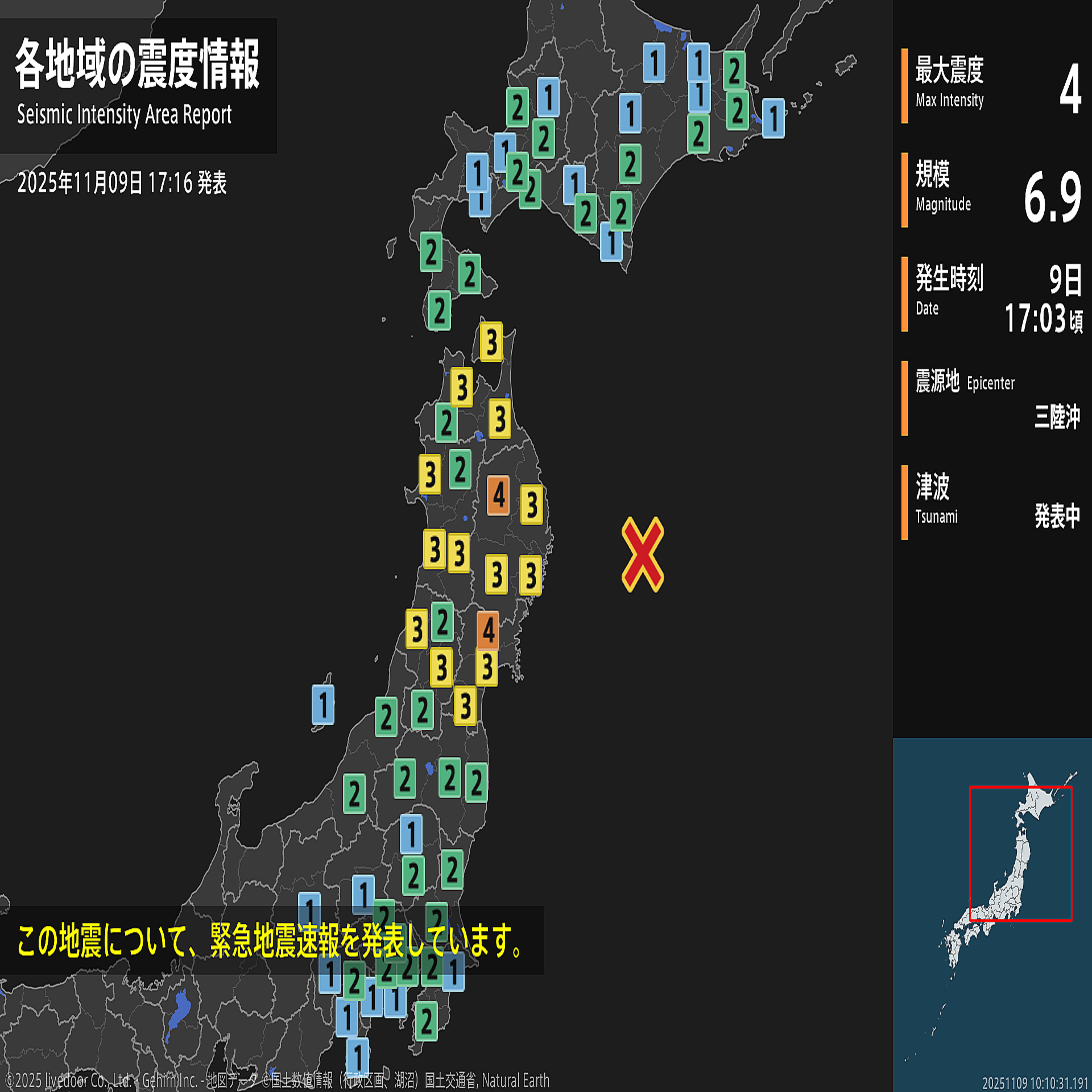 【地震情報 2025年11月9日】(19:10更新)17時3分頃、三陸沖を震源とする地震がありました。震源の深さは約20km、地震の規模はM6.9、最大震度4を岩手県、宮城県で観測しています。津波警報等(大津波警報・津波警報あるいは津波注意報)を発表中です。【地震情報 2025年11月9日】(17:16更新)17時3分頃、三陸沖を震源とする地震がありました。震源の深さは約10km、地震の規模はM6.7、最大震度4を岩手県、宮城県で観測しています。津波