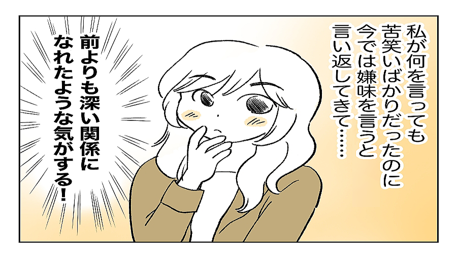 人生半分損しているね!」この言葉をどう捉えますか?誇張しすぎだと思うか、それとも見下されていると思うか……。「してないよ!」と返せる人もいれば「私は人生の半分も損しているのだろうか」と考え込んでしまう人もいるかもしれません。今回は、ある女性と義姉のお話です。第11話気持ちの変化【ミキの気持ち】【編集部コメント】意外なことに、言い返すスズカさんに対してミキさんは喜びを感じていました。今までのうわ