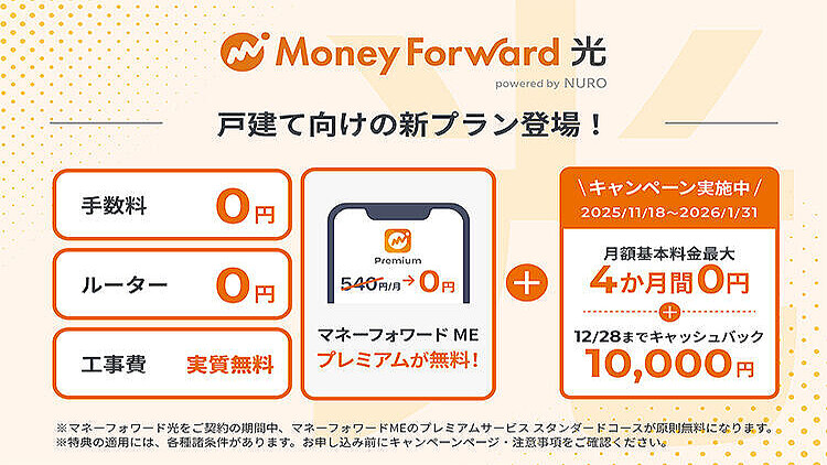 ソニーネットワークコミュニケーションズは11月18日、マネーフォワードホームとの連携施策として、「マネーフォワード光 powered by NURO」の提供開始を発表した。NURO 光、「マネーフォワード」と連携した新プラン月額540円の「マネーフォワード ME」プレミアムサービススタンダードコースが付帯するインターネット回線サービス。2ギガプランと10ギガプランを戸建て向けに提供するというもので、マネーフォワード ME」と連携。固