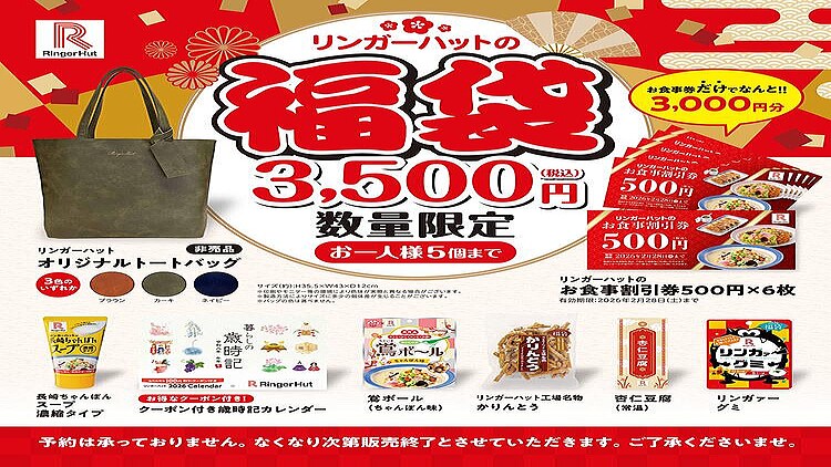 リンガーハットは、2025年12月10日から全国のリンガーハット店舗(一部店舗除く)で、数量限定の福袋を販売開始します。割引券やオリジナルグッズ、限定のお菓子などを詰めたお得な内容です。買い占めたいくらいお得!●福袋の内容・お食事割引券500円の割引券が6枚、合計3000円分。1会計で複数枚併用できるため、家族や友人との食事にも使いやすいのがポイント。テイクアウトにも利用可能です。・クーポン付き歳時記カレンダー202