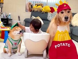 3兄妹が愛犬2匹をドライブスルーごっこに興じる様子を映した動画