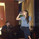 ピアノの上に座り、Tシャツにゆるズボンといったラフな格好で歌う姿をアップ