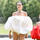 オフショルダーのネックラインと素材が特徴的な白いドレスを披露